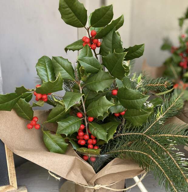 Такой букет уместно впишется в любой интерьерный стиль: от классики до сканди. Можно добавить чертополох и другие необычно и даже грубовато выглядящие растения. А вот от нежных декоративных цветов вроде роз или тюльпанов в таком букете лучше отказаться — остролист просит более «дикого» соседства, напоминающего о зимнем лесе.Соцсети флориста busybeebouquets