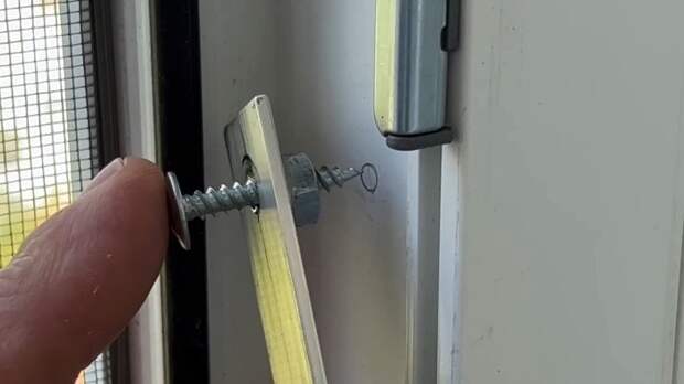 Крепим пластину через меньшее отверстие к внутренней стороне оконной рамы в расчетном месте с помощью самореза с круглой головкой, поместив между рамой и пластиной подходящую по размеру гайку. Саморез не затягиваем полностью, для того чтобы пластина могла свободно поворачиваться вокруг самореза, как на оси вращения.