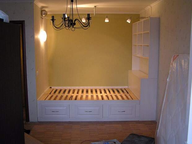 Небольшая кровать в нише однокомнатной квартиры. По совместительству - спальня, библиотека и хранилище для разных крупных вещей.