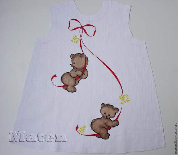 В нашем случае будет нарядное платье трапецией, примерно на 2 годика (рост 92). Для начала необходимо определиться с рисунком: что будет нарисовано, где рисунок расположить и какого размера сделать. Я решила нарисовать что-нибудь милое, поэтому остановилась на маленьких озорных медвежатах.