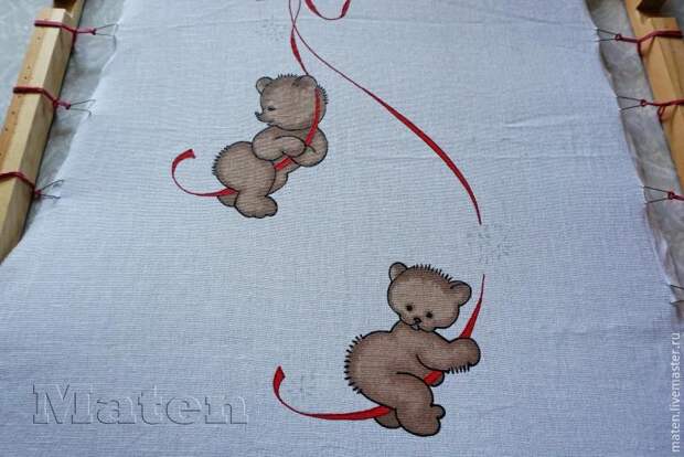 Берем кусочек ткани, на который уже перенесена выкройка нашей детали (где будет рисунок) и аккуратно натягиваем на раму с помощью когтей или обычных кнопок.