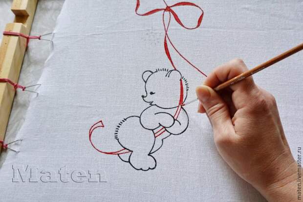 Совет: Если ткань достаточно плотная, то рисунок через нее почти не виден. В этом случае можно использовать стекло (как стол) и лампу: ткань кладется на стекло, рисунок между стеклом и тканью, а под стекло ставится лампа так, чтобы свет падал с низу вверх. В этом случае можно тогда сначала перевести рисунок на ткань, а потом только ее натягивать. Я пошла другим путем: так как модель небольшая, то я перевела рисунок через окно (как в детстве!) и потом натянула. Скажу честно, это не очень удобно, но иногда я так делаю.