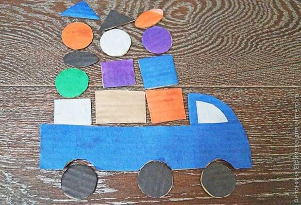Я нарисовала домики, машину, деревья и различные фигурки: треугольники, квадратики, круги, овалы, прямоугольники. Все крупные предметы поделила на разное количество частей, чтобы процесс конструирования постепенно, можно было усложнять.