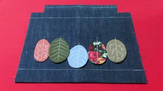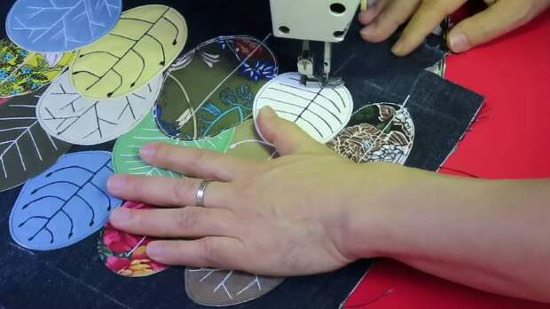 Противоположную сторону подогните на 5 см, заутюжьте. Наметьте, где будет располагаться декор из лоскутков. Расположите их, сколите булавками или сметайте вручную. Мылом нарисуйте форму листьев.