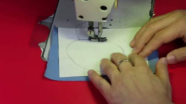 Совместите, нарисуйте овал произвольного размера, прошейте на машинке. Вырежьте по контуру. Сделайте надрез в тонкой ткани, выверните на лицевую сторону.Джинсовая основа