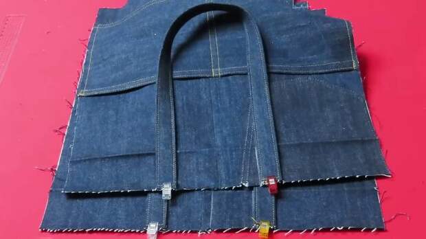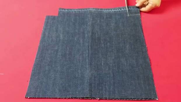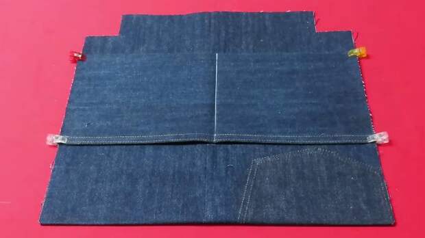 Ко второй детали из джинсов подготовьте ещё одну — это будут карманы. Отрез джинсовой ткани 40*21 см дважды подогните на 1 см, заутюжьте и прошейте. Найдите середину, сшейте детали вместе, сформировав 2 кармана.