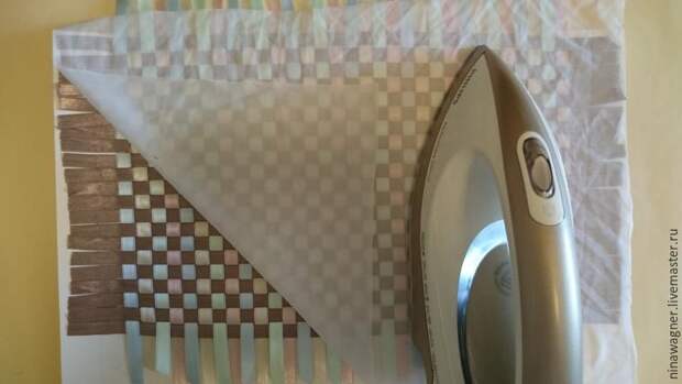 Вырезаем по размеру дублерин на клеевой основе и с помощью утюга наклеиваем на нашу плетеную поверхность.