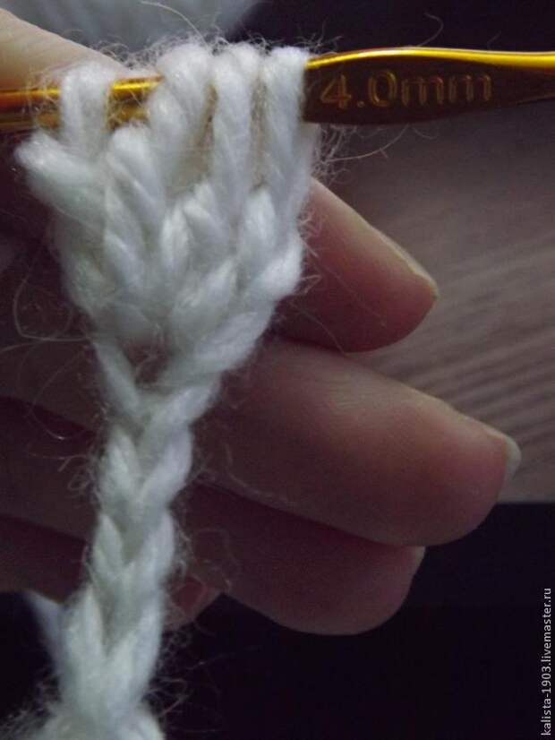 Итого у нас : первый ложный столбик образованный 3 воздушными петельками и 3 столбика с одним накидом с открытыми вершинками, всего на крючке 4 петли.