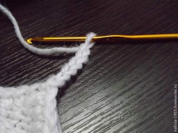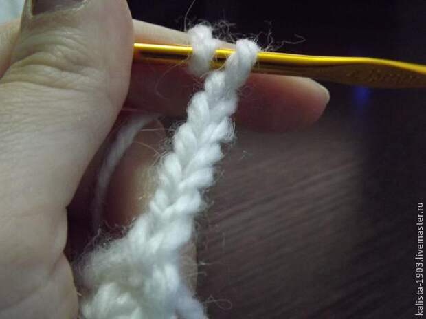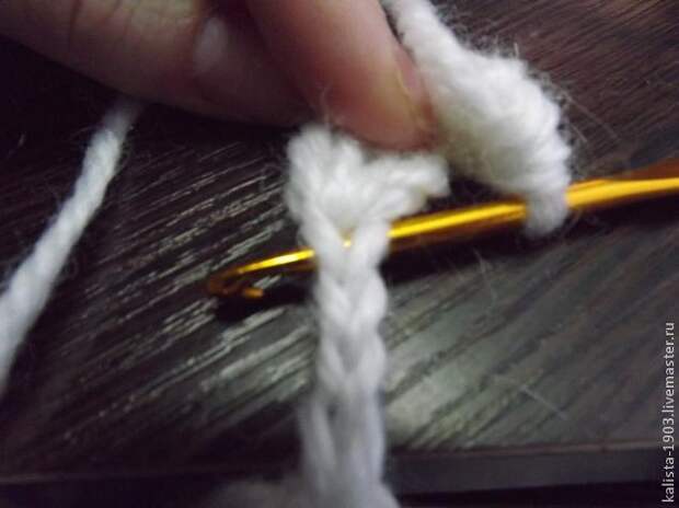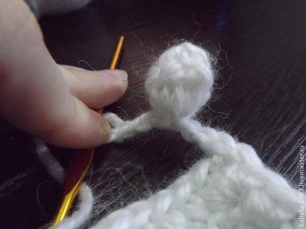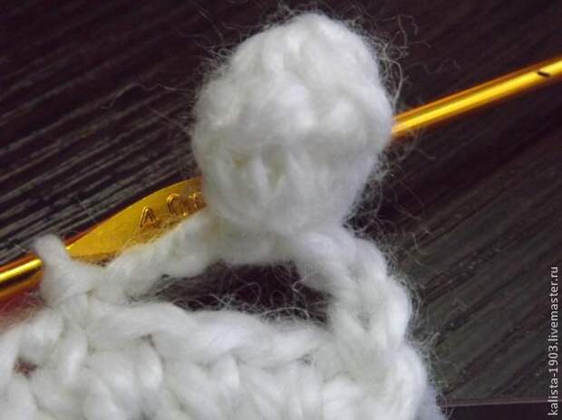 Шаг 9 - в третью петлю от крючка провязываем так же как в первый раз 3 столбика с накидом, оставляя при этом открытые вершинки, как я уже описывала.