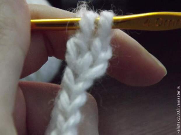 Шаг 5 - в третью петельку цепочки провязываем столбик с накидом , Но с открытой вершинкой, т.е не довязываем последнюю петельку данного столбика, на крючке должно получится 2 петельки.