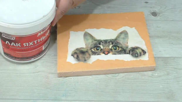 На четвертую стенку приклеиваем распечатанный на принтере рисунок, закрепляем лаком.