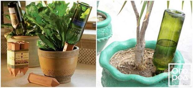 Винная бутылка, наполненная водой, поможет сохранить влагу в почве не хуже популярных шаров "Аква Глоб". Чтобы вода поступала постепенно, на горлышко бутылки наденьте колпачок с острым "носиком" и небольшим отверстием в нем.