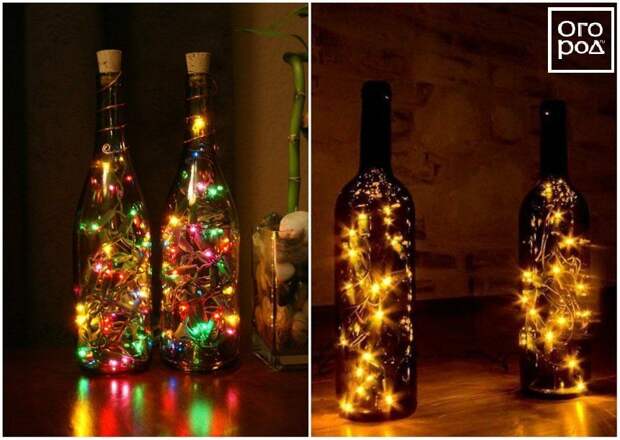 А в канун Рождества и Нового года можно просто опустить в пустую бутылку электрическую елочную гирлянду. Эффект завораживающий!