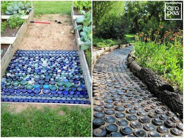 Весьма оригинально смотрится в саду дорожка, вымощенная винными бутылками, перевернутыми дном вверх. Но между ними нужно обязательно насыпать песок, чтобы не было скользко.
