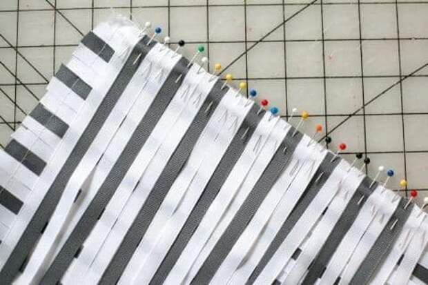 Вторую часть тесьмы выкладываем поперек ужи прошитой и также крепим каждую используя швейные иголочки.