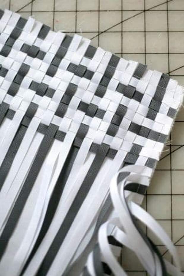 Аккуратно начинаем переплетать тесьму между собой, чтобы получилось красивое соединение двух цветов.