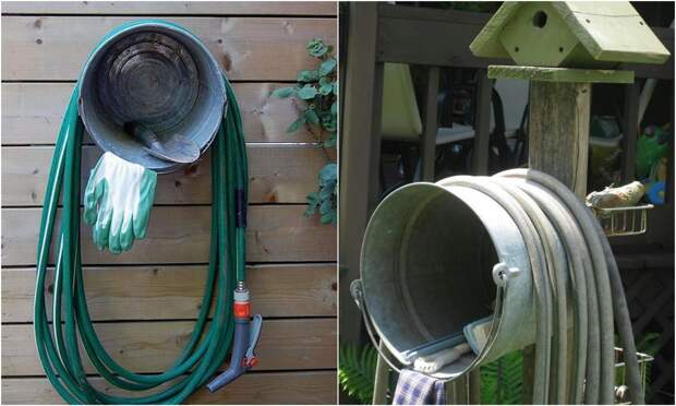 Прибиваете ведро дном к стене хозблока или забора. Все! Сверху на ведро наматываете шланг. Его будет удобно снимать и не придется распутывать. Внутрь же можно положить садовую лопатку, секатор, перчатки, небольшие грабельки — то, чем вы пользуетесь чаще всего во время работы в огороде.