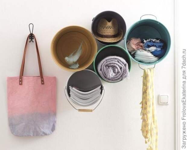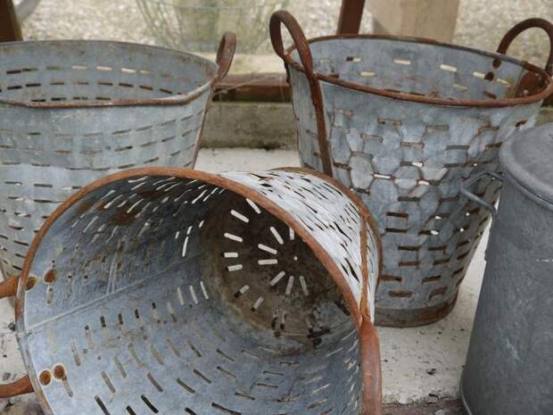 - Подберите подходящие ведра. Если вы будете располагать их в одном месте, продумайте цвета: они должны сочетаться между собой и с цветом помещения. По фактуре выбирайте так, чтобы все ведра были либо блестящие, либо состаренные. Глянцевые и с искусственной стариной могут смотреться не очень хорошо.