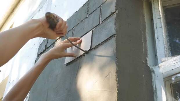 Старую краску со стен и окон следует счистить. Цементную штукатурку замесить с водой до густой консистенции, нанести на стены. С помощью трафарета из картонки прорезать «кирпичи».