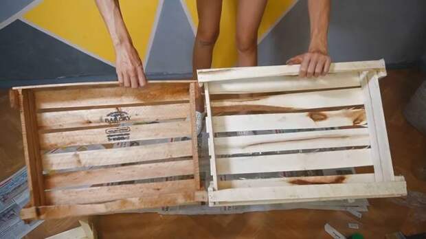 Чтобы сделать бесплатные открытые полки на балконе, можно взять на рынке ящики — их выбрасывают за ненадобностью. Покрасить морилкой, по желанию, нанести трафарет.