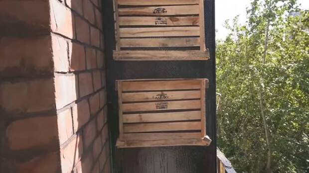 Стену на балконе также покрасить в желаемый цвет. Прибить саморезы, установить на них ящики.