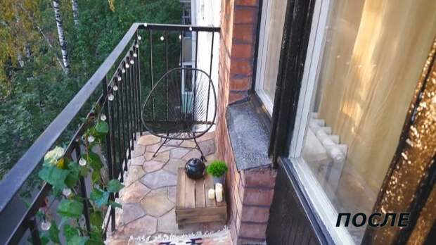 Установлен стул под цвет балкона и низкий «столик» из того же ящика. Можно ещё постелить ковёр. Получилось очень достойно и совсем за небольшую сумму!