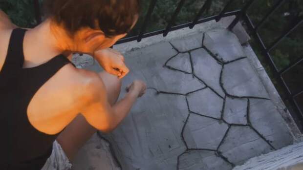 На пол выложить смесь из цементной штукатурки и стяжки (1:1), разведённой водой до нужной густоты. Выровнять широким шпателем, затем вручную прорезать узор, имитирующий натуральный камень.