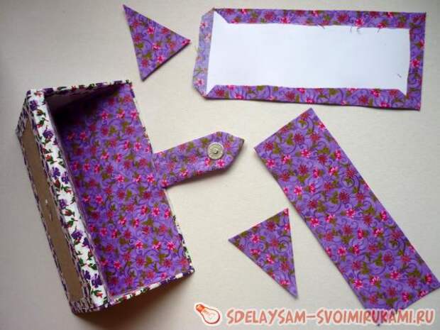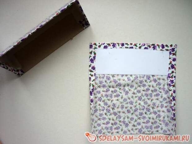 Отрежем ткань так, чтобы заклеить сторону с и b одновременно. Приклеим заготовленный кусочек ватмана для стороны с, заклеивая всего три стороны.