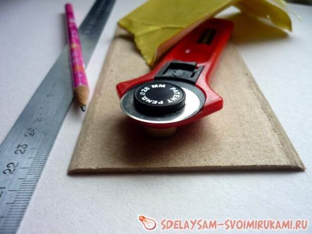 • карандаш, стек, линейка, канцелярский или дисковый нож, кисть для клея, нитки, игла, ножницы.