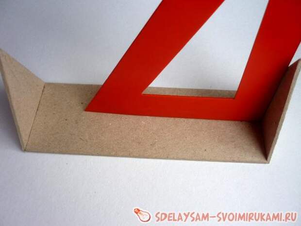 Приклеиваем боковые стороны (треугольники) к основе, регулируя линейкой с острым углом, чтобы они были перпендикулярны основе.