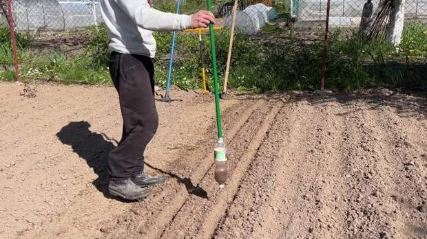 Открутите крышку, насыпьте семена. Верните крышку на место. Переверните бутылку, держась за черенок. Заранее подготовьте углубления в земле. Теперь просто, не нагибаясь, пройдитесь вдоль лунки и посейте семена.