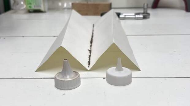 Проверить, как работает сеялка, просто. Насыпьте в бутылку семена, закрутите крышку с носиком. Положите согнутый лист бумаги. Переверните бутылку вверх дном и потрясите. Если семена выходят ровной строчкой и не слишком быстро, то всё сделано правильно!