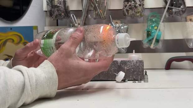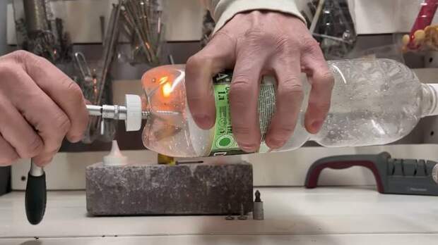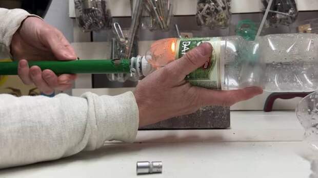 Однако нужно усовершенствовать сеялку, чтобы не пришлось наклоняться во время работы. Для этого возьмите вторую бутылку, открутите у неё крышку. В дне первой бутылки сделайте отверстие горячим гвоздём. Вставьте саморез в крышку и закрутите.