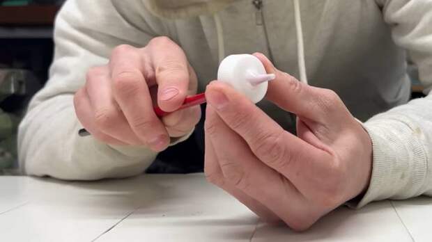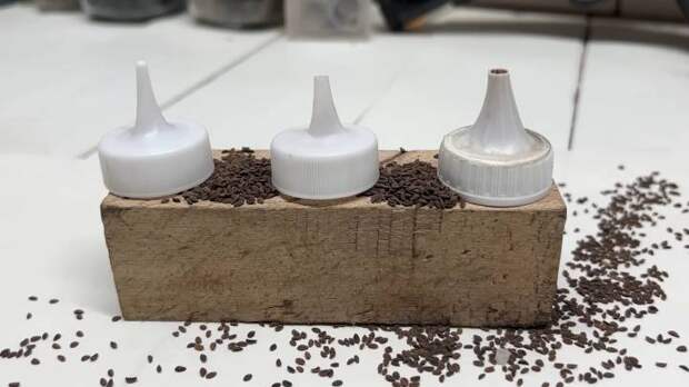Открутите крышку. Нагрейте её с лицевой стороны. Теперь возьмите деревянную шпажку, или спицу, или палочку для суши. В мягком пластике сделайте длинный носик.Теперь нужно отрезать кончик. Насколько сильно отрезать — зависит от размера семян. Можно сразу сделать крышки для семян разного размера и менять по необходимости!