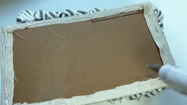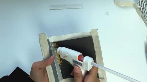 Обклейте картон тканью и зафиксируйте детали внутри корзины.