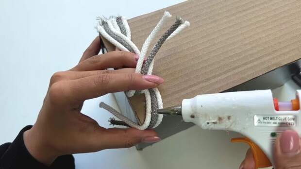 Для создания красивого плетения на коробке потребуются заготовки из трех шнуров каждая. Подготовьте отрезы шнура, длина которых на 5 см превышает высоту коробки. Зафиксируйте отрезки шнура на верхней части коробки с помощью горячего клея. Переплетите отрезки шнура. Для фиксации краев и деталей непосредственно на коробке также используйте горячий клей.