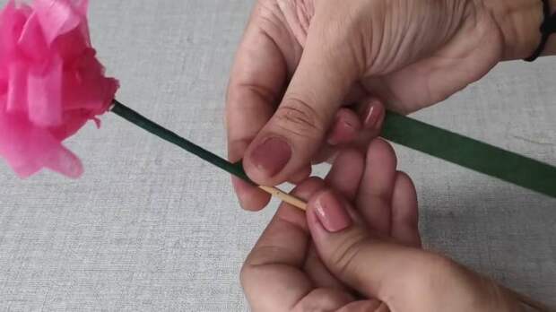 Зафиксируйте клеем на деревянной палочке. Её саму оберните зелёной лентой/бумагой.