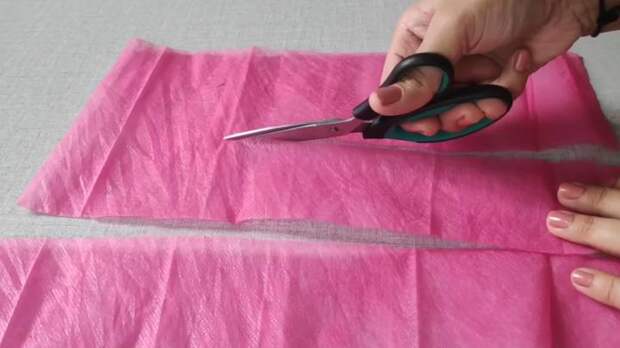 Отрежьте у пластикового пакета часть с ручками. Нарежьте «тело» пакета на 3 полоски.