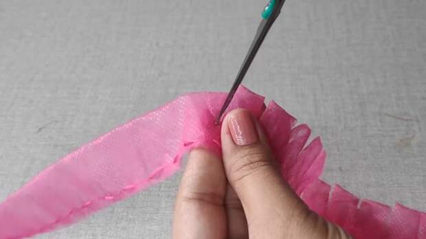 Теперь возьмите ножницы. Подрежьте противоположный стежку край. Делайте надрезы на равном расстоянии друг от друга.