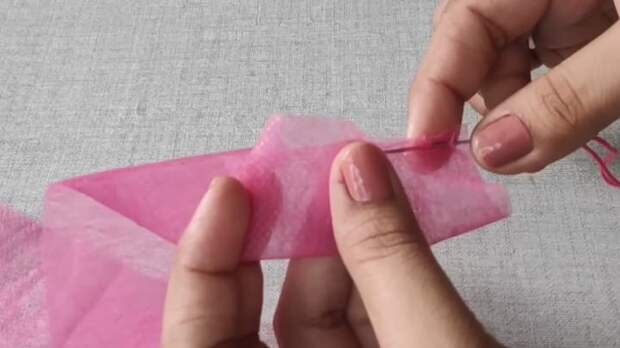 Возьмите иглу и нитку подходящего цвета. Сложите полоску из пакета пополам. Соберите её по краю (стежок «вперёд иголка»).