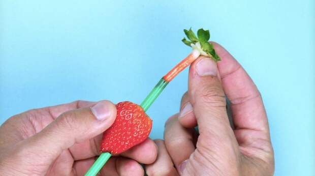 Можно, конечно, отщипнуть листочки от сочной ягоды, как мы привыкли делать всегда, а можно удалить лишнее с помощью соломинки: протыкаем ягоду и выталкиваем все лишнее.