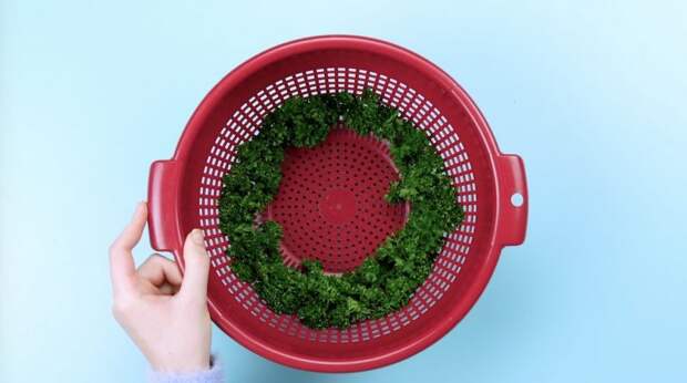 Чтобы быстро отделить листья свежей петрушки от стебельков, берем дуршлаг. Протягиваем стебелек через отверстие, и листочки остаются внутри.