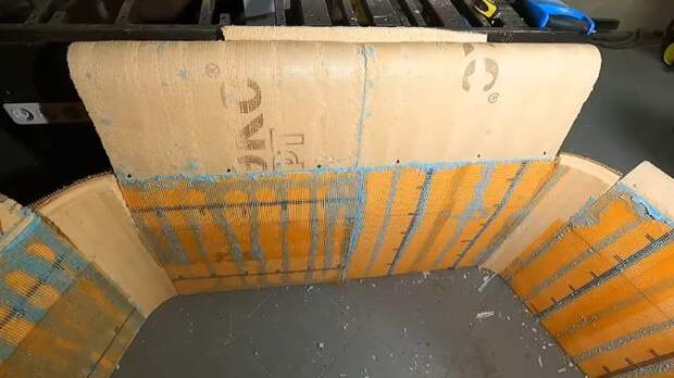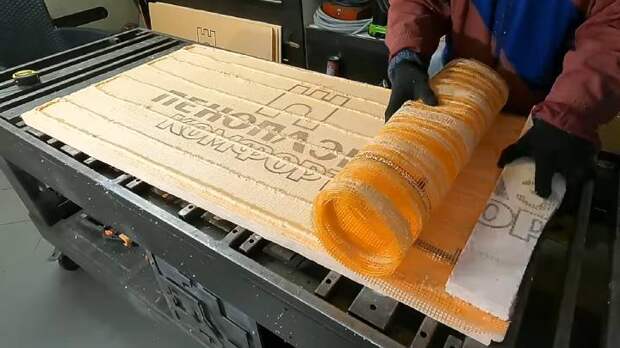 Сделайте надрезы на пеноплексе и начните его сгибать. Благодаря сетке он будет продолжать держать всю конструкцию. Зафиксируйте на пару часов в согнутом виде. Сделайте то же самое со вторым листом Пеноплекса, но в зеркальном отражении (для другого подлокотника будущего дивана).