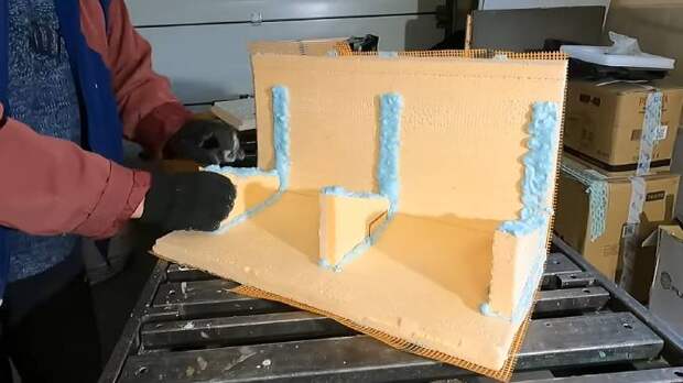 Повторите те же самые действия с двумя половинками листа утеплителя. Также изогните и зафиксируйте. Внутрь временно приклейте несколько маленьких кусочков Пеноплекса для лучшей фиксации.