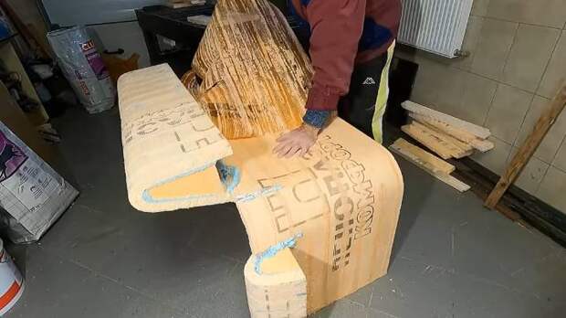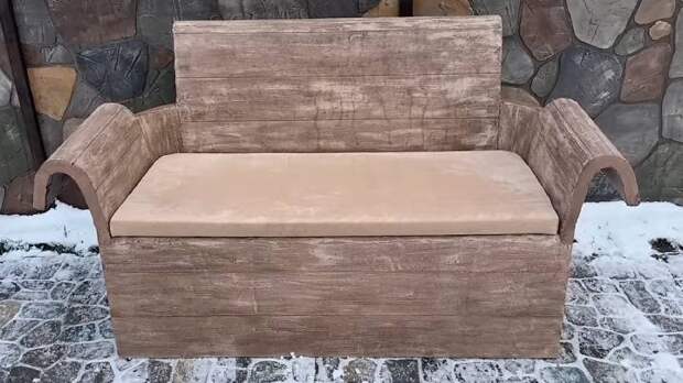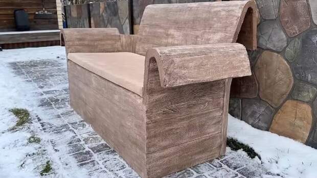 Пожалуй, утеплитель — самый неожиданный материал для изготовления садовой мебели. Поразительно, но из него вполне можно сделать полноценный уличный диван, который будет выдерживать достаточный вес, оставаться крепким и прочным. Да к тому же выглядит он очень даже стильно — под дерево! Каждый дачник сможет сделать такой садовый диванчик себе на участок.
