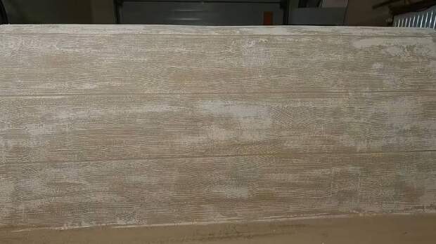 Получившуюся поверхность можно декорировать как душе угодно! Замесите и нанесите плиточный клей. На резиновом шпателе сделайте зубцы. С его помощью нарисуйте узор дерева на утеплителе. Сделайте прорези-линии, имитирующие доску.