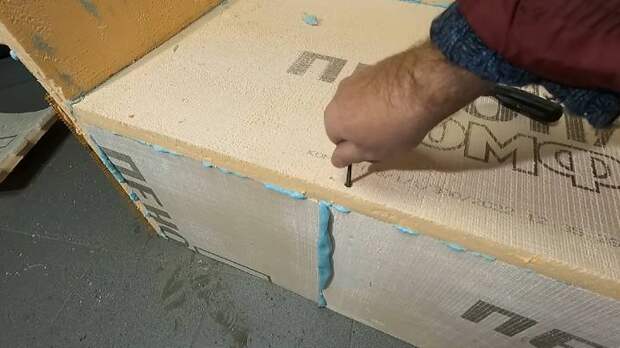 С помощью ножовки по дереву сделайте шершавую поверхность на листах Пеноплекса. Кромку по бокам срежьте. Строительной клей-пеной приклейте штукатурную стеклосетку. Высоту будущих подлокотников и сидения можно замерить с помощью любого кресла.