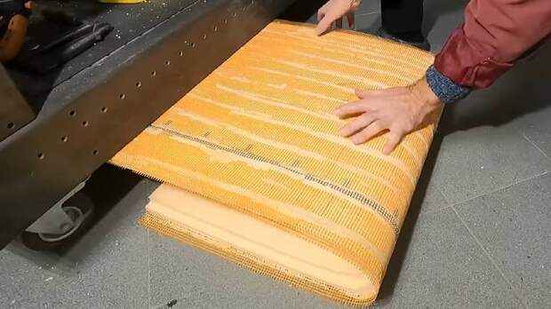 Удалите сетку с одной стороны — она уже сыграла свою роль. Приклейте сидение из цельного листа утепителя. Отрежьте лишнее.