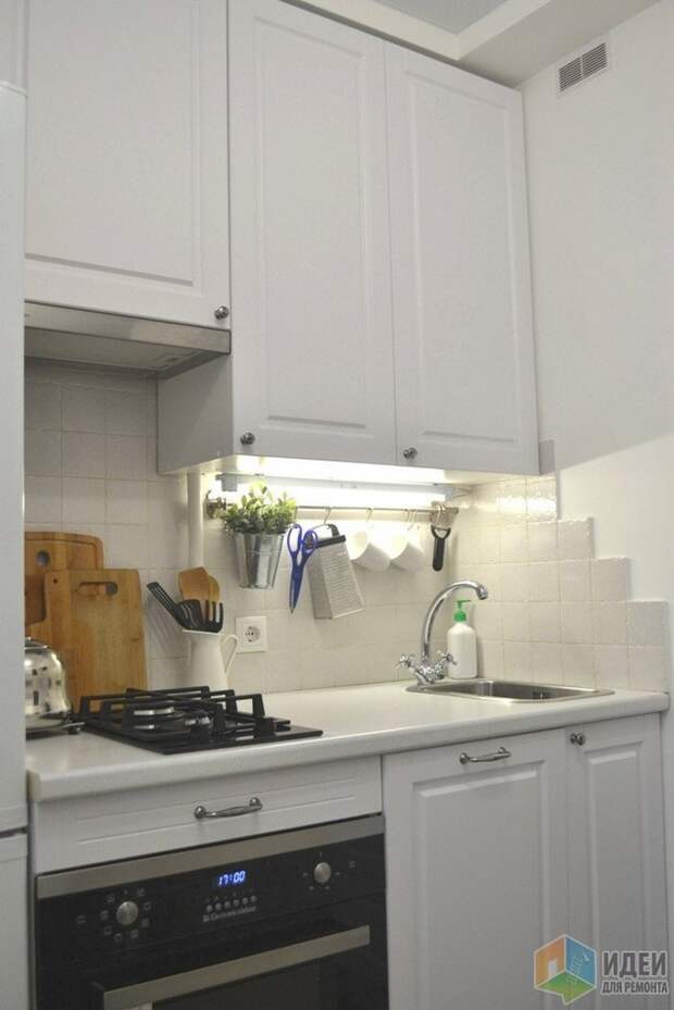 Гофру вытяжки удалось удачно спрятать, а рабочего пространства на кухне как раз хватает, чтобы решить все связанные с готовкой вопросы.