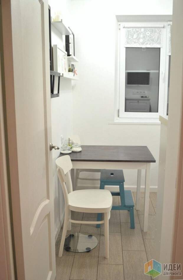 Ящик над дверью открывается со стороны коридора, там антресоль: как мы уже ранее говорили, места в хрущевке мало, и приходилось выкручиваться, чтобы использовать его с умом. А в небольшой столовой вполне хватает места для уютного семейного обеда или торопливого завтрака.